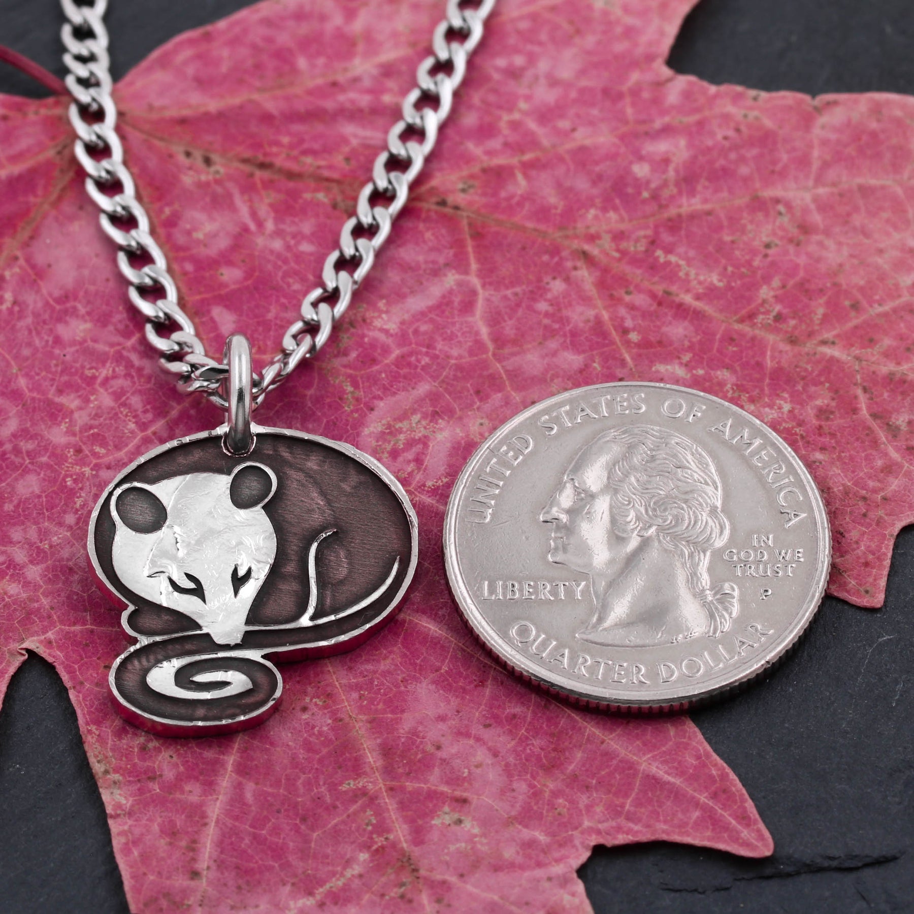 This curled up opossum necklace is made out of a quarter that has been cut by hand. It comes with a high quality chain of your choosing.