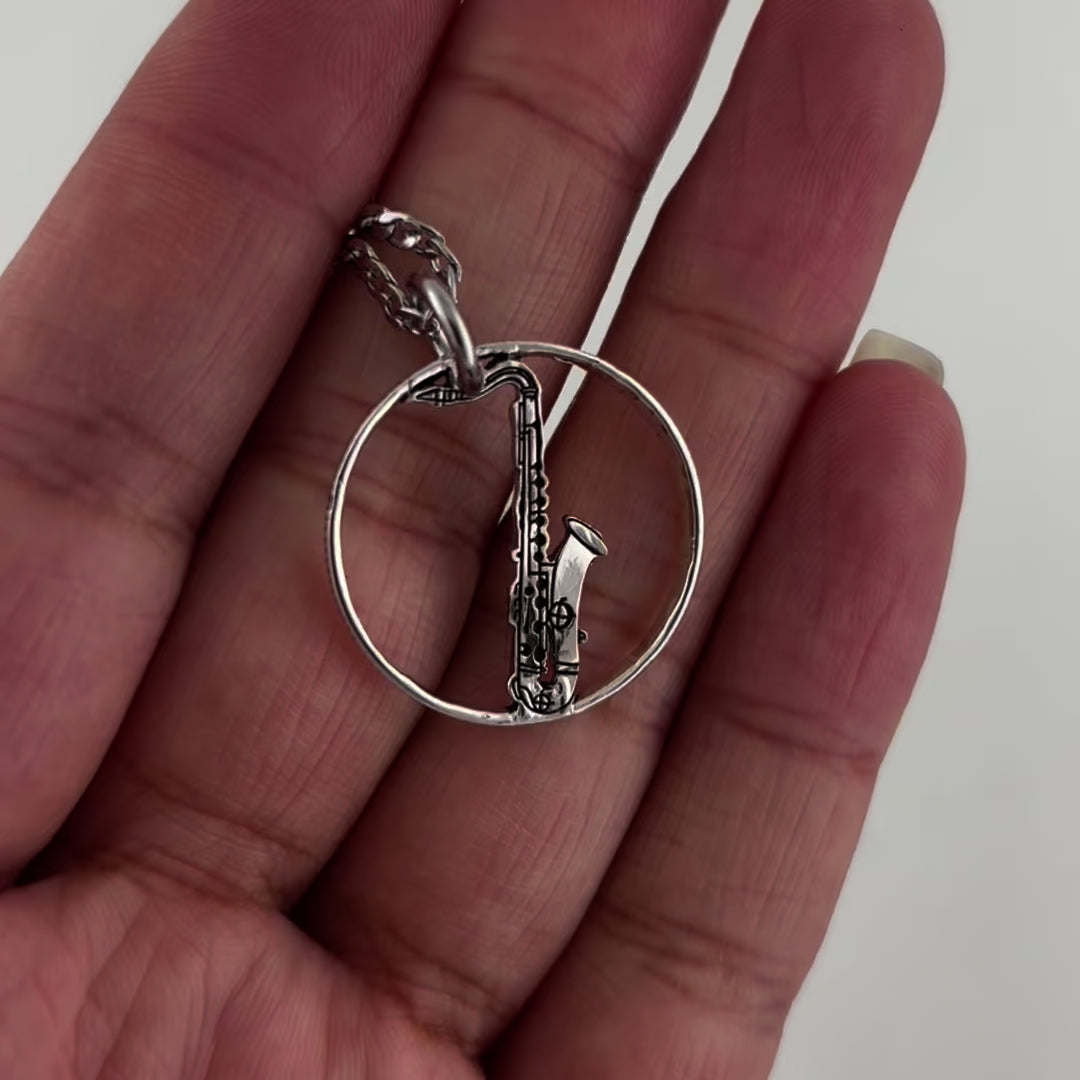 This necklace features a bass clarinet that is engraved to show more of its fine detail. See the special detail put into making this a special piece for you. Our thin rim styles are created to give more emphasis to the design being featured while not taking away from the novelty of the original media: a coin.