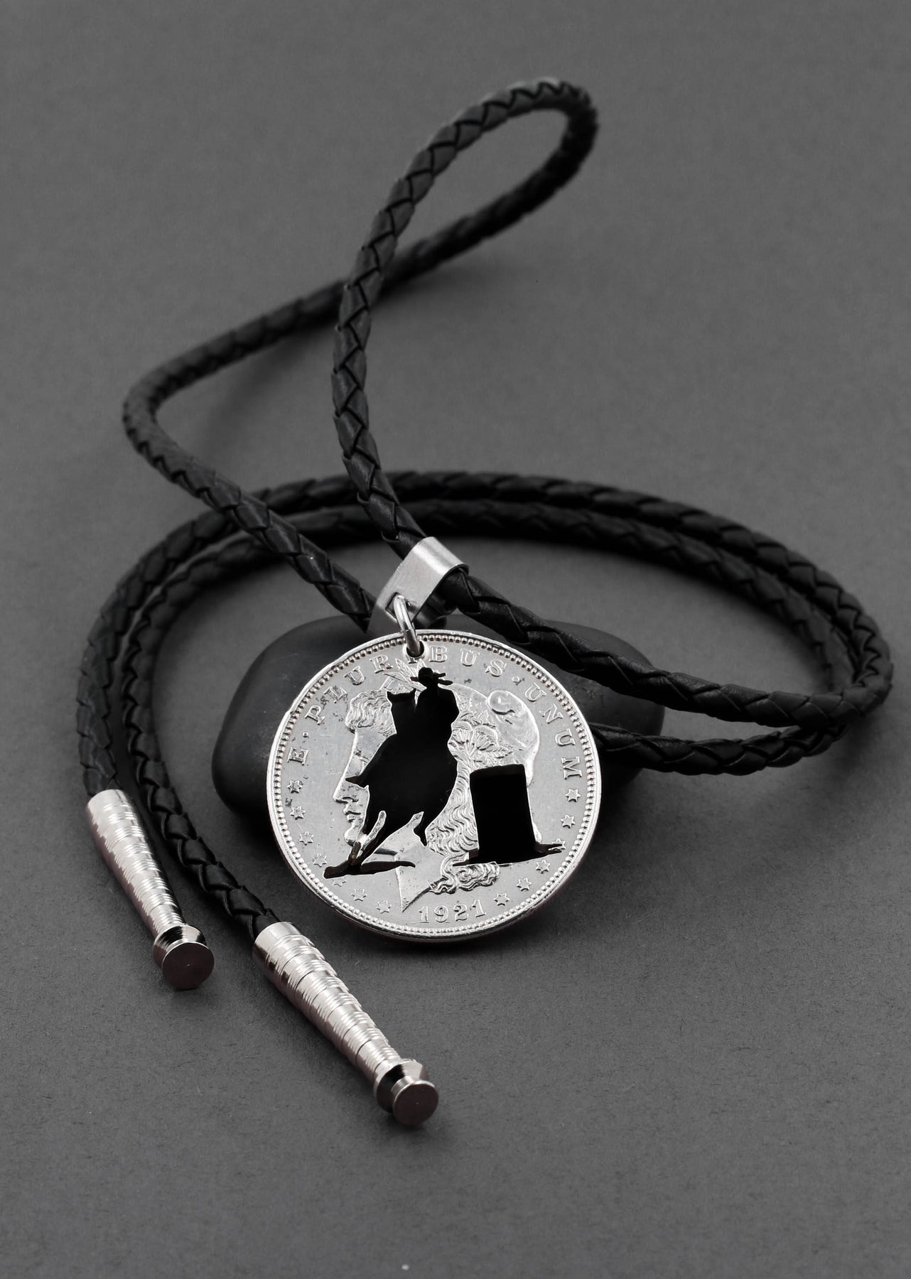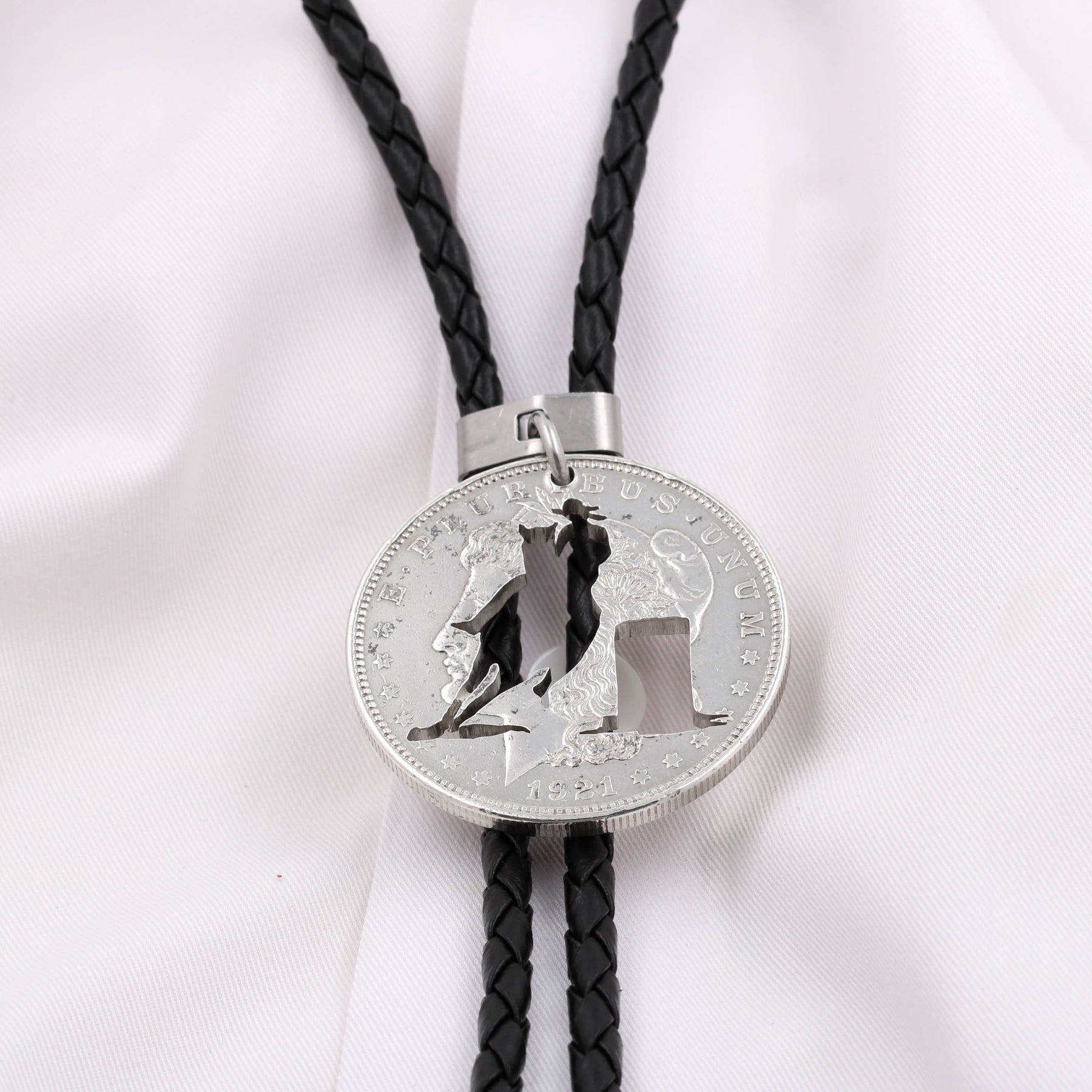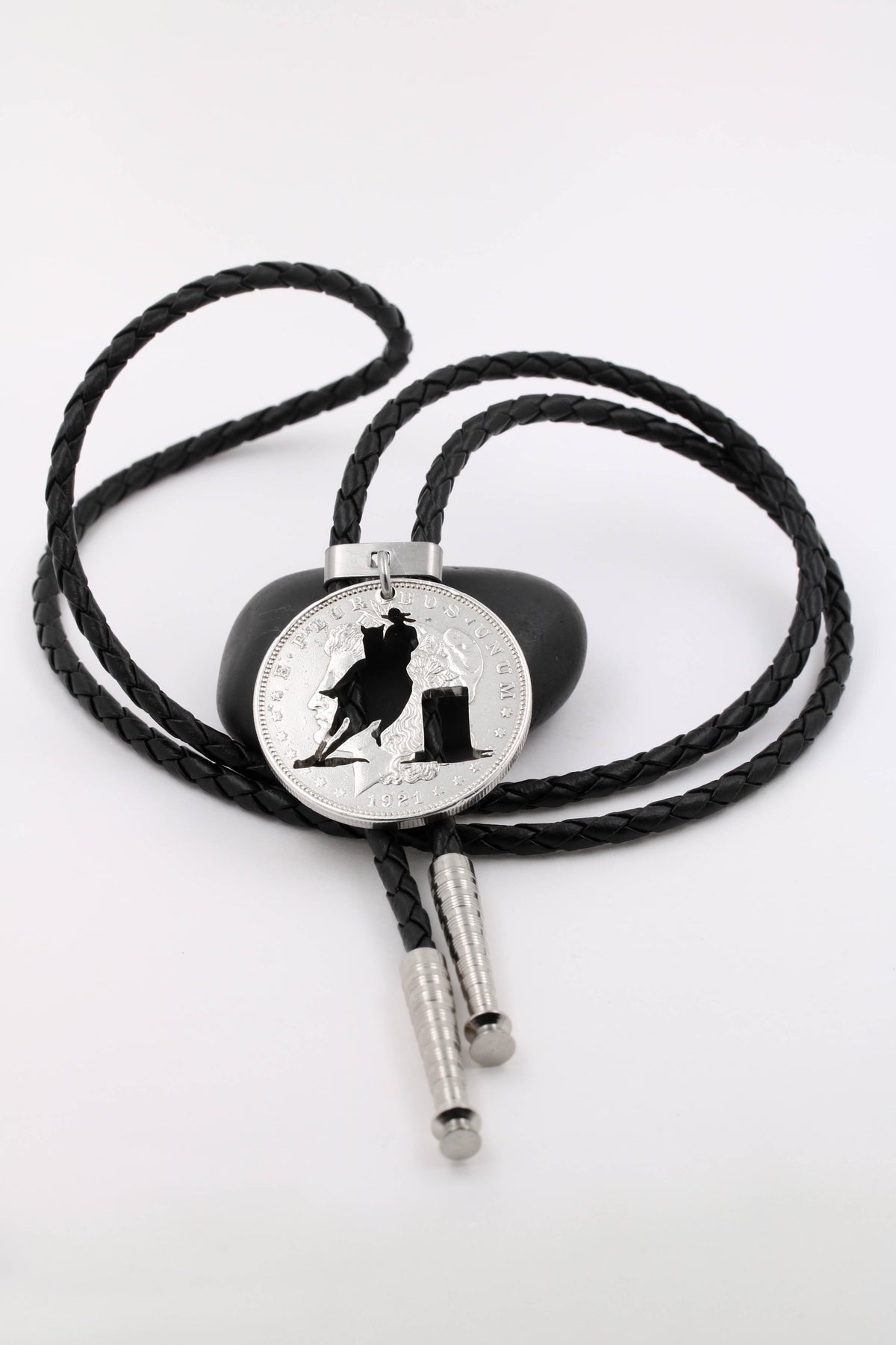 This is a very unique bolo necklace featuring a barrel racer cut on a silver dollar. It is hand made from a real US coin and it really pops out. We use genuine braided leather for this necklace.