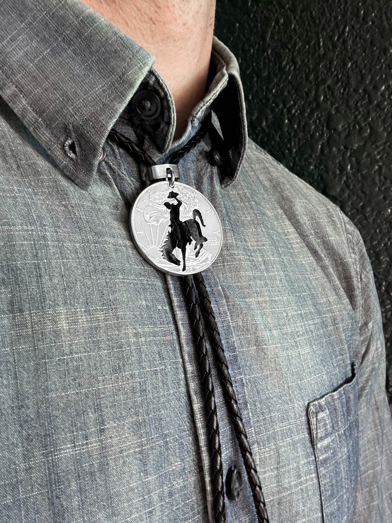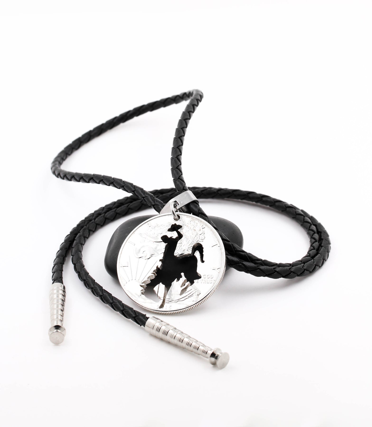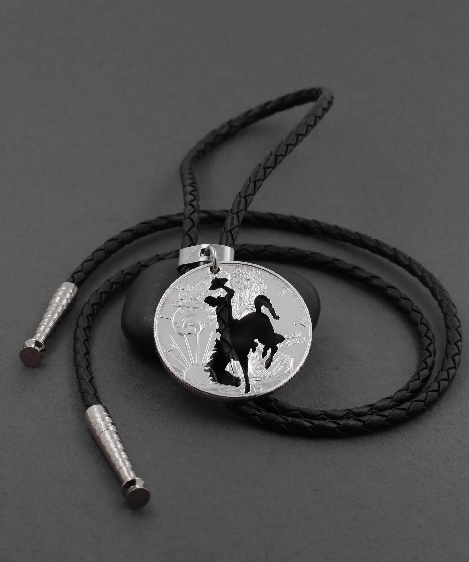 This is a very unique bolo necklace featuring a bucking horse cut on a silver eagle. It is hand made from a real US coin and it really pops out. We use genuine braided leather for this necklace.